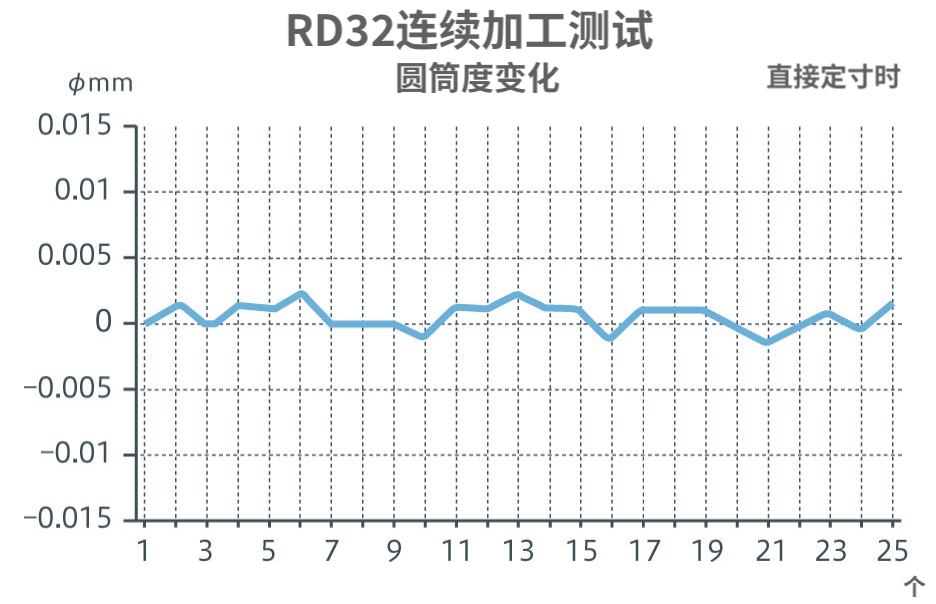 通過提高主軸、進給軸等的機械構(gòu)造精度和剛性,以及進給  控制的最小指令單位φ0.1μm,實現(xiàn)高加工精度。重復(fù)加工精度穩(wěn)定,即使在冷卻啟動時,1小時后的圓筒度變化也為φ3μm/50mm(RD23/RD32)。